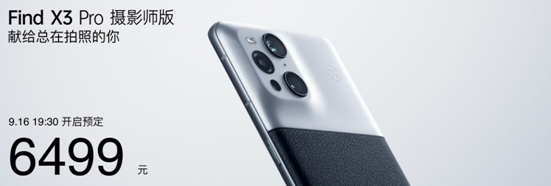 OPPO Find X3 Pro摄影师版售价6499元(16+512GB),随机附送一年期OPPO 1TB超大云盘以及一年期NOMO会员,即日起接受预订,并将于9月22日10:00在OPPO官方商城-欢太商城,以及京东、天猫、苏宁易购等线上渠道全面开售。同时,OPPO体验店、三大运营商合作厅、苏宁、国美、迪信通、顺电等线下卖场会同步开售。