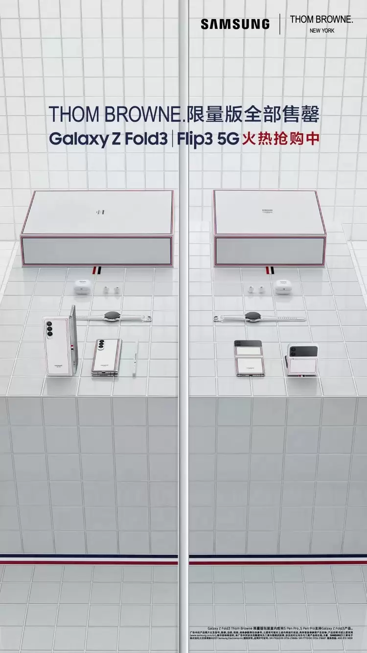 三星电子与时尚品牌Thom Browne打造的全新限量版产品一经公布就受到极高的关注。在经过了第一批抢购的火速售罄后,9月17日,三星Galaxy Z Fold3|Flip3 5G Thom Browne限量版第二批抢购活动如约而至。产品上架后,线上全渠道随即火速售罄,再次展现出高端时尚与前沿科技相结合后带来的极高人气。此外,没有抢到Thom Browne限量版折叠屏手的消费者也不用遗憾,普通版本的三星Galaxy Z Fold3|Flip3 5G同样是很好的选择,并且目前也正在火热抢购中。