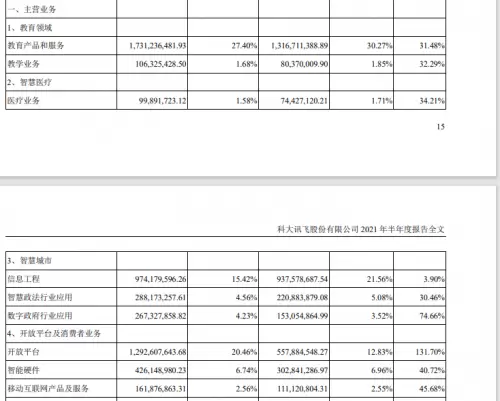 据科大讯飞发布的2021年年中报显示,上半年科大讯飞营收63.19亿元,同比增长45.28%,净利润4.19亿元,同比增长62.12%,扣非后净利润2.09亿元,同比增长2720.80%。整体业务发展稳健,营收能力持续提升。各业务中,开放平台和消费者、教育、智慧城市三大业务表现最为亮眼。其中开放平台业务实现营业收入12.93亿元,同比增长131.70%。