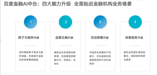 为解决金融行业痛点,针对行业智能化升级中的具体情况,全面升级的百度金融AI中台解决方案,为金融机构提供更场景化、更符合监管要求、更适合金融机构智能化发展不同阶段需求的AI智能底座。