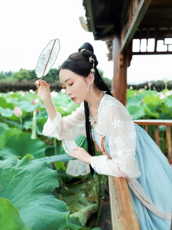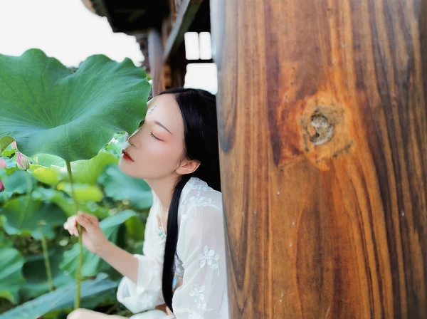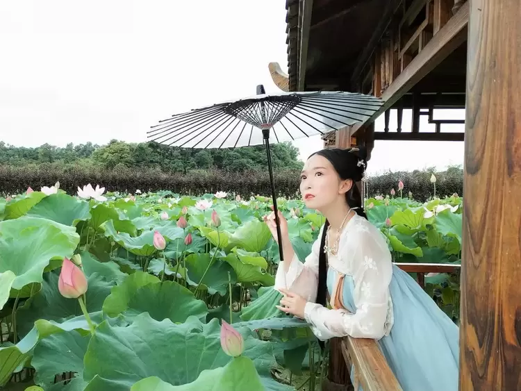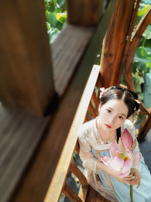在需要突出人物与环境的互动上,_SEVEN_尝试使用了美图T9电影人像模式,它拥有阶梯式技术虚化效果,比肩单反拍摄的虚化效果,看起来很自然,实现人、景、光分离重构。既能够对人物进行更为突出的刻画,又对远方的荷花池景色进行虚化处理,使之不会"喧宾夺主",但近处的荷花又能与人物相映成趣。