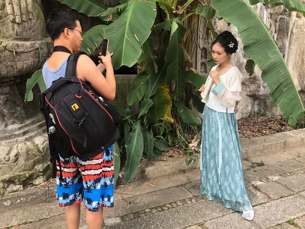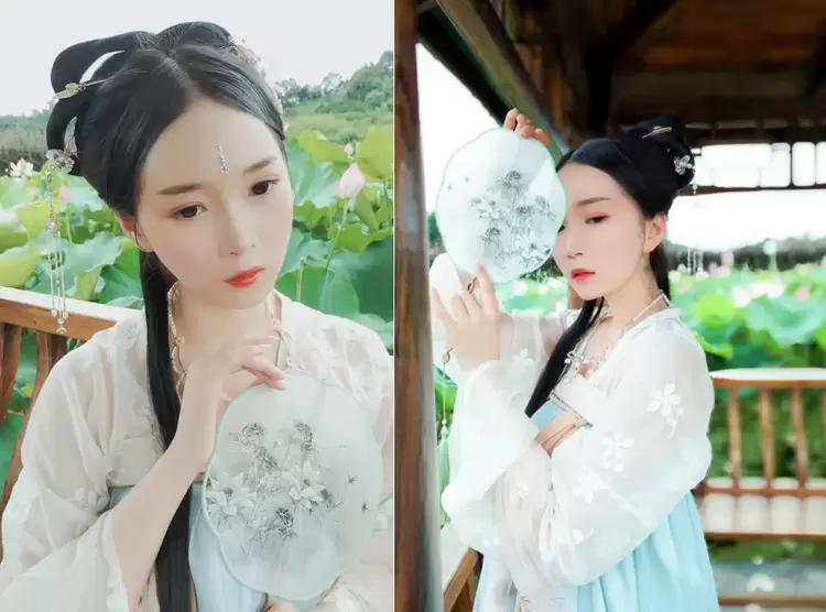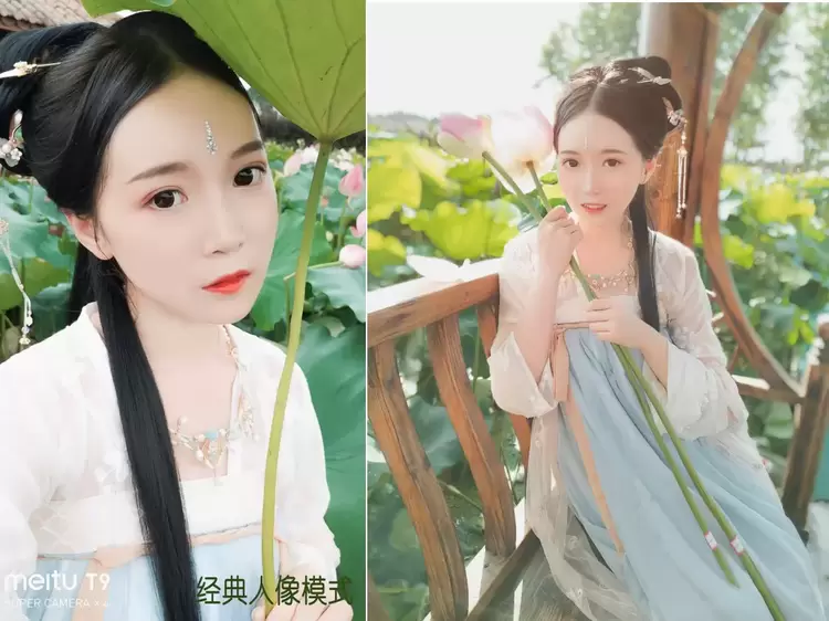 在第一组以荷花池为主题的古风主题拍摄中,_SEVEN_首先采用了经典人像模式,在他看来,这种模式下整体比较柔和的美颜效果,很适合用来拍摄温柔感类型的照片,尤其是对古风妆面进行更为柔美的展现,同时保证背后莲叶、荷花的色彩饱和度。