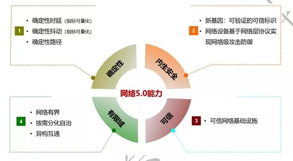 从2018年联盟诞生起,笔者就持续关注网络5.0的发展,了解到网络5.0作为面向2030的新一代网络架构,将以现有IP网络协议为基础,采取“分代目标、有限责任”的思路,围绕确定性、内生安全、可信、有限域四方面核心目标,开展网络能力演进。