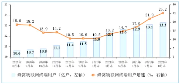 9月22日消息,近日工信部发布2021年1-8月份通信业经济运行情况,数据显示:蜂窝物联网用户增长较快,截至8月末,三家基础电信企业发展蜂窝物联网终端用户13.3亿户,比上年末净增1.9亿户。