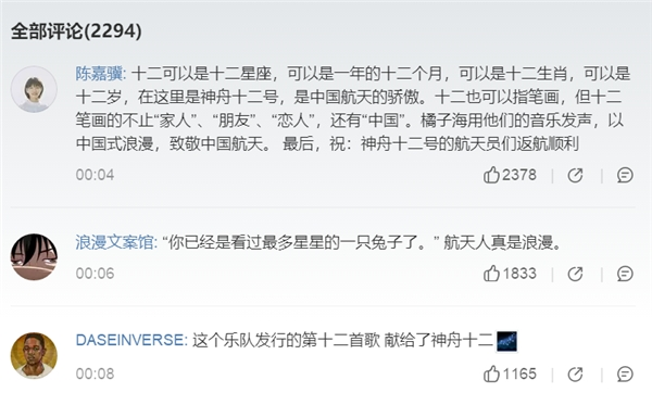 北京时间9月17日下午时分,神舟十二号载人飞船返回舱在东风成功着陆,为迎接神舟十二号返航,网易云音乐策划、橘子海乐队创作的最新歌曲《十二》全新上线。歌曲《十二》旨在献礼中国航天,用“中国式浪漫”致敬航天人。在网易云音乐上线两天,歌曲《十二》获得广泛传播,也引发了广大青年对于“中国式浪漫”这一概念的讨论,获得众多用户留言点赞。