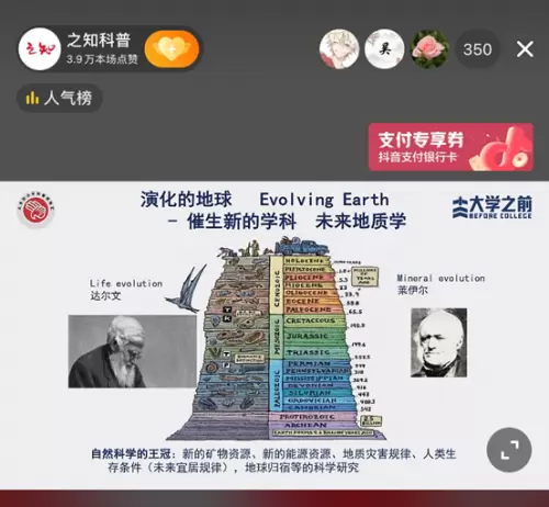 据了解,在本次开学科普季活动中,除了翟明国院士关于地质学科普的分享,抖音邀请邬贺铨、陈征等40位各个领域的专家学者,在9月1日至9月30日期间,围绕科学、艺术、文化等领域,通过在线直播的方式传播权威、专业的科普知识,分享他们的人生选择和思考。该活动致力于通过短视频直播联动各领域大家,激发青少年的学习兴趣、拉近人们和科学的距离。