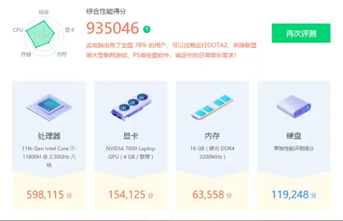 在处理器跑分软件Geekbench5中单核跑分1579,多核跑分达到了9175,与上一代的i7 10875H相比,单核性能领先23%,多核领先25%。作为目前最新的11代酷睿TigerLakeH CPU,i7-11800H的领先之处在于采用了频率更高,功耗压制更出色的Willow Cove微架构,毫不夸张的说这就是英特尔目前移动端最强的处理器之一。