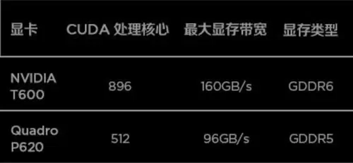 CUDA处理核心上T600为896颗而P620仅512颗,前者采用GDDR6显存而后者为GDDR5显存类型,T600的最大显存带宽也提升到了160GB/s,因此在面对需要3D渲染的场景以及图形密集型任务时NVIDIA T600的表现显然要更加出色。