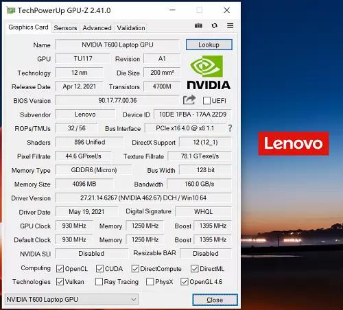 当然了,为了满足大型图形处理软件,比如PR、AUTOCAD等专业软件的需求,显卡的性能同样十分重要。本次ThinkPad P15v系列最高支持NVIDIA RTX A2000 显卡选配,而我们手里这款则搭载了NVIDIA T600专业显卡。对于喜欢电竞的朋友来说可能更多熟知的还是NVIDIA RTX系列,但T600作为工作站GPU,主要发力点则是在2D / 3D图形工作以及视频工作的负载上。