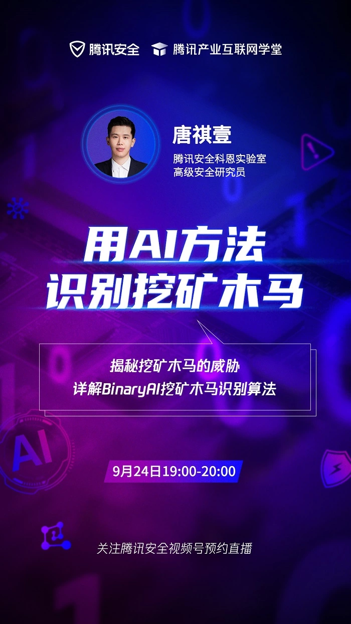 近年来,挖矿木马呈明显增长的趋势,而传统的检测识别方法又存在局限性。那么,有没有什么办法,可以有效识别挖矿木马?9月24日,腾讯安全科恩实验室高级安全研究员唐祺壹,以“BinaryAI: 用AI方法识别挖矿木马”为主题,从挖矿木马的发展趋势与威胁、BinaryAI的原理与机制以及BinaryAI如何识别挖矿木马等方面我们讲解基于AI技术的挖矿木马识别解决方案。