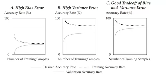 学习曲线描述的是验证或测试样本(即样本外)中的准确率(=1–错误率)与训练样本中的准确率,是描述欠拟合和过拟合的偏差和方差误差的函数。如果模型是有用的,则随着训练样本大小的增加,样本外的准确度也会提高。这说明在验证或测试样本(Eout)中和训练(Ein)样本中彼此的错误率非常接近,并朝着期望的错误率(基本误差)收敛。如下图左图所示,在具有高偏差误差的欠拟合模型中,高误差率会导致收敛低于所需的准确率。添加更多的训练样本不会改善模型。如下图中间图所示,在具有高方差误差的过拟合模型中,验证样本和训练样本的错误率无法收敛。在构建模型中,数据专家试图在选择具有良好预测或分类能力的算法的同时尽量减少偏差和方差,如下图右图所示。