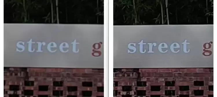 在这组样张中,最明显的差异在于解析力。黑白主摄参与成像后可见样张的解析力得到了明显提升,英文字体的边缘变得更加锐利。