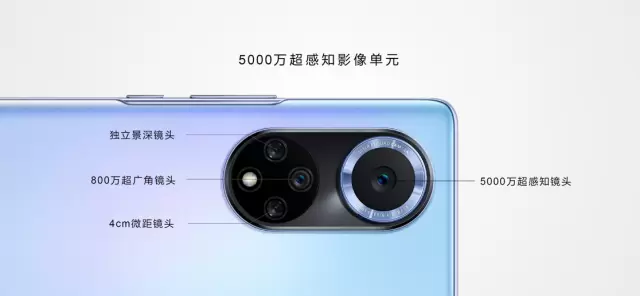 5000万超感知影像系统,包含一颗50 MP 超感知主摄、一颗8 MP 超广角镜头、一颗4 cm微距镜头及一颗独立景深镜头。 ↑