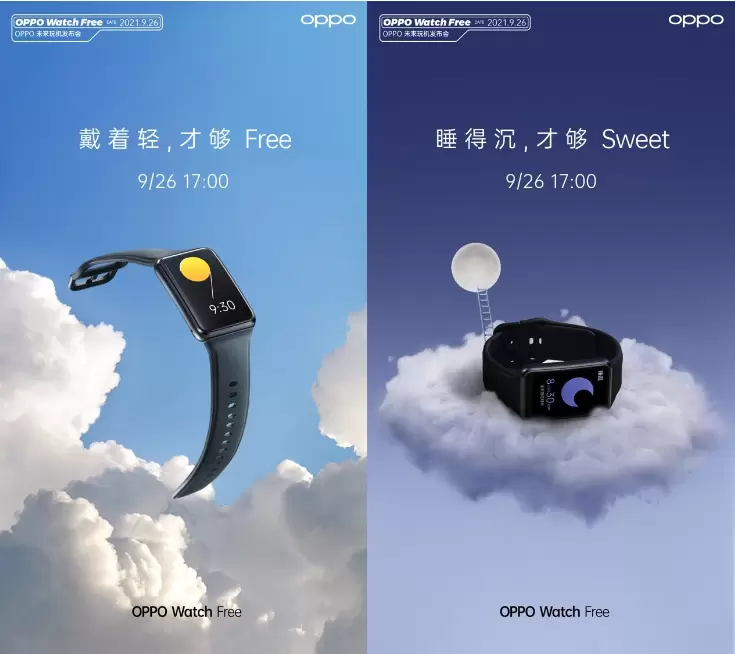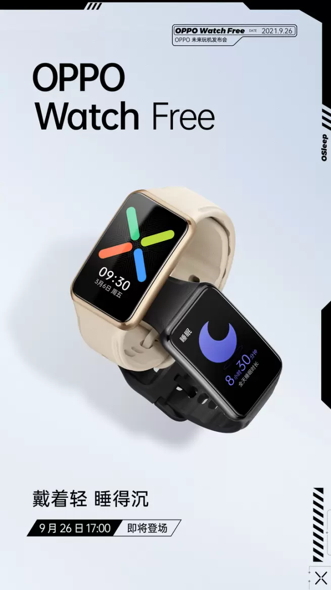 9月24日,OPPO宣布将于9月26日的“OPPO未来玩机发布会”期间发布全新的智能手表OPPO Watch Free。该手表主打“戴着轻、睡得沉”,结合近日OPPO官方的预热海报,可见其不仅十分轻巧,佩戴舒适,还将会在睡眠相关功能方面颇具看点。