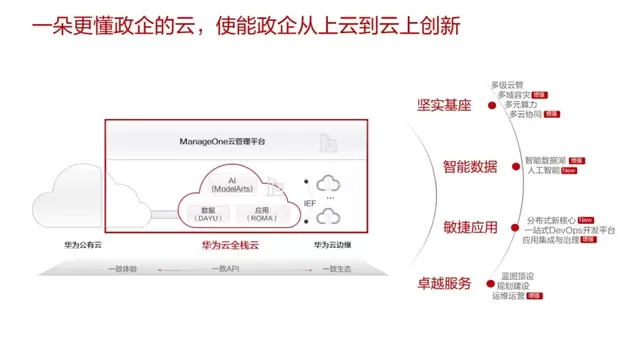坚实基座:云基础设施是云平台的底座,华为云Stack提供多元算力、多云协同、多域容灾和多级云管,为政企打造坚实的基座,实现全面云化目标。多元算力即一云多芯、一云多池,支持多CPU架构和多虚拟化形态平滑入云。通过云联邦2.0实现多云协同,为跨多地、多厂商的公有云提供统一入口,帮助用户快速构建混合云。同时,华为云Stack提供业界唯一多地域、全场景、租户自助的容灾解决方案,实现核心业务无改造上云,降低全面云化的成本,保证业务永远在线。最后,华为云Stack支持最多五级的管理架构,充分适配众多大型政企的多级组织架构的特点。