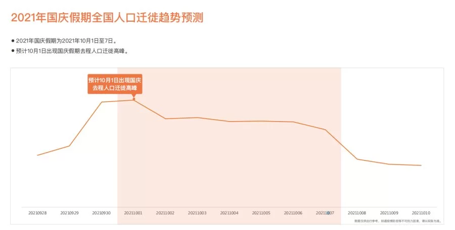 疫情防控形式仍然严峻,十一黄金周出游依然不能放松。百度地图十一预测大数据显示,国庆假期第一天将出现人口迁徙最高峰,而在接下来的6天里,全国人口迁徙逐渐呈下降趋势。可见,全国人民十一出行的意愿依旧高涨。