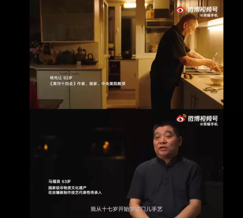 纪录片中,92岁的杨先让曾在4年前14次走访黄河8省市、自治区,记录、抢救黄河流域的非遗风貌,编撰成非遗著作《黄河十四走》。因为条件的限制,民间艺术面花、泥塑、剪纸不易保存,成为消失的艺术让杨先让现在想起来都很遗憾,并感慨“我们如果那个时候,有个手机多好啊”;另一位63岁的花丝镶嵌非遗传承人马福良则从十七八岁起开始学习这门技艺,致力于把从前秘不外传的宫廷技艺传承到寻常百姓家,掐丝、填丝、编织、堆垒、焊接、錾刻、点蓝等工序复杂又精细,马福良感慨用荣耀Magic3系列拍完之后“跟那个显微镜差不多,帮助我们把这个作品看的更清晰”。