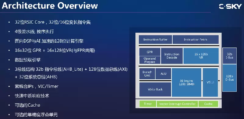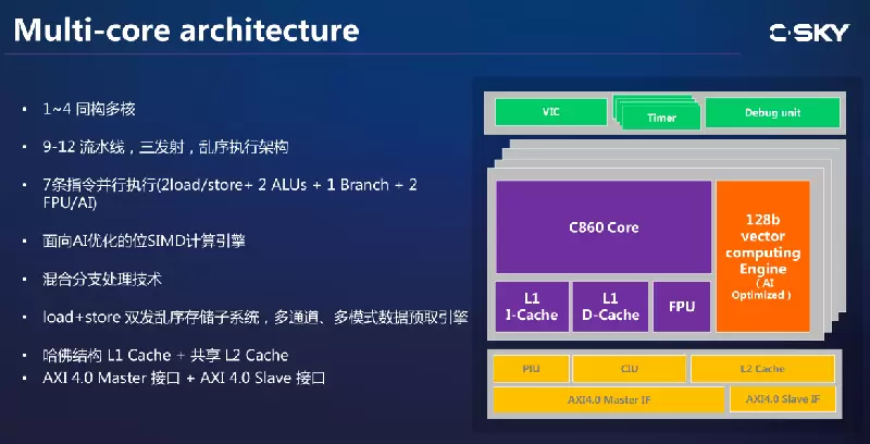 在多核架构上,CK860可实现1至4核同构,9至12条流水线,7条指令并行执行(2load/store+ 2 ALUs + 1 Branch + 2FPU/AI),搭载面向AI优化的位SIMD计算引擎,通过load+store双发乱序存储子系统,多通道、多模式数据预取引擎。