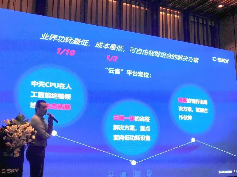中天微智能云音平台历时两年三个月的研发准备,在此次峰会上正式揭开面纱。据劳懋元介绍,目前在业界,智能云音平台可以实现功耗最低、成本最低、可自由裁剪组合的解决方案。其功耗是国内现阶段市场产品功耗的十分之一,成本也缩小到二分之一。