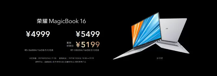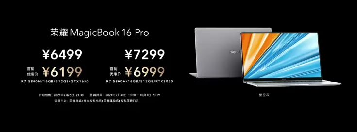 荣耀MagicBook 16 Pro锐龙版,R7-5800H/16GB/512GB/GTX1650 版售价6499元,首销优惠价6199元;R7-5800H/16GB/512GB/RTX3050 版售价7299元,首销优惠价6999元!
