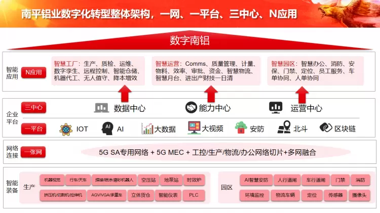 目前,中软国际通过优秀的5GtoB商业化能力,交付了众多行业客户。以南平铝业为例,围绕5G MEC打造七类定制化业务平台,包含AI智慧安防平台、ICT融合数据中心、3D数字孪生平台、电能质量管理系统、视频业务管理平台、5G智联平台及区块链产品溯源管理,助力南平铝业实现从传统制造业向信息化转型的重要目标。通过云边间业务相关能力的协同,形成中心云+MEC一体化的整体云服务能力;同时整合离散信息系统及IT服务资源,形成统一高效的数据平面,打造企业级5G工业互联基础,建设5G全连接车间,赋能OICT融合。在人力成本、检测时常、运维成本、运输成本、能源消耗等诸多方面实现降本增效的能力,并实现数字化管理、平台化操作、专网融合等诸多应用价值。