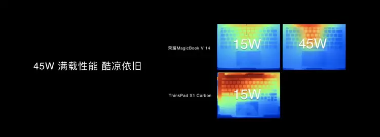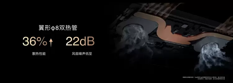散热方面,荣耀MagicBook V 14采用翼形大直径双热管设计,辅以2.2万mm²散热鳍片和9颗温度传感器精细控温技术,通过双风扇和转轴出风口设计,以及转轴辅助进风口设计,创新打造倒三角热力区,即使重度负载状态下,酷凉面积依然能达到85%以上,带来别样的酷凉、静音新体验。