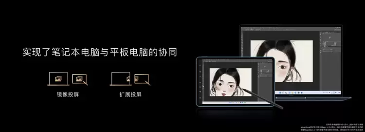 荣耀MagicBook V 14还可直接实现与Pad联动,在镜像模式下,利用Pad的触摸和手写笔能力,辅助PC侧的PS等专业软件获取更好体验,同时视频通话和影音播放从PC到Pad体验接续,让镜像也能顺滑流畅;在扩展模式下,Pad作为PC的扩展屏,同时浏览两个窗口,提升并行处理效率。荣耀MagicBook V 14与荣耀平板多屏协同功能,将在2021年10月升级后支持。