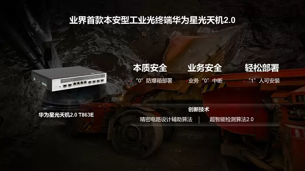 对此,华为推出第二款针对高安全场景的工业光终端,也是首款本安型工业光终端华为星光天机2.0,可在矿井和石化等场景,承载视频、传感、机械控制等业务,并且相比上一代产品,华为星光天机2.0实现了网络设备的本质安全,业务安全和轻松部署。