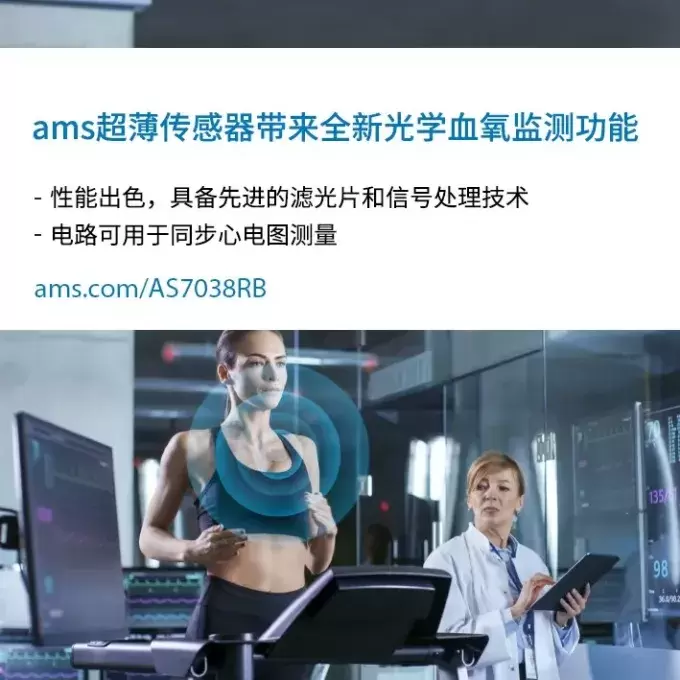 血氧饱和度衡量人体血液内的血氧含量,是判断人体呼吸循环系统是否正常运转的重要指标,对肺炎、哮喘、慢性阻塞性肺病(COPD)和心力衰竭等呼吸系统疾病的患者尤其关键。心率是最直接反映心脏健康的标志,几乎是可穿戴设备的标配。血氧饱和度和心率监测能不能由一颗传感器实现呢?光学大咖艾迈斯欧司朗已经推出了集成测血氧和测心率功能的光学传感器,最亮眼的产品当属行业超薄血氧饱和度(SpO2)测量专用传感器AS7038RB,集小尺寸封装、高度集成、小空间设计等优势于一身,该传感器采用3.70 mm x 3.10 mm小型封装,厚度仅0.65 mm。其中集成了1个高灵敏度光电二极管、4个LED驱动器、1个模拟前端和1个程序发生器。此外,还随附提供SpO2和心率测量应用软件。模拟前端支持同时进行ECG测量,并且符合IEC 6060-2-47医学标准的要求。