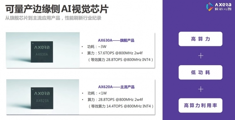第二款芯片AX620A目前也已回片并成功点亮,与AX630A旗舰级定位不同,AX620A定位于4K/30帧以下,400万或500万像素主流市场需求,可提供14.4TOPS@INT4算力,1080P分辨率情况下功耗不到1瓦,预计今年年底实现量产。