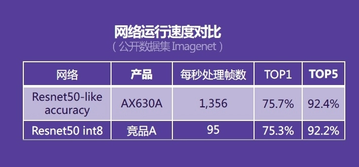 下图展示了在公开数据集Imagenet上的网络运行速度对比。可以看出,在Resnet50精度基本不变的情况下,AX630A每秒可处理1356帧,远高于竞品95帧/秒的处理速度。