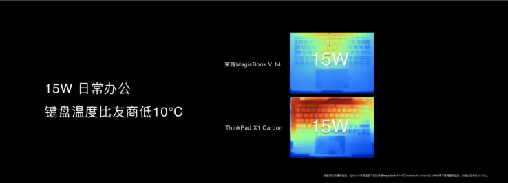 散热方面,荣耀MagicBook V 14采用翼形大直径双热管设计,辅以2.2万mm²散热鳍片和9颗温度传感器精细控温技术,通过双风扇和转轴出风口设计,以及转轴辅助进风口设计,创新打造倒三角热力区,即使重度负载状态下,酷凉面积依然能达到85%以上,带来别样的酷凉、静音新体验。