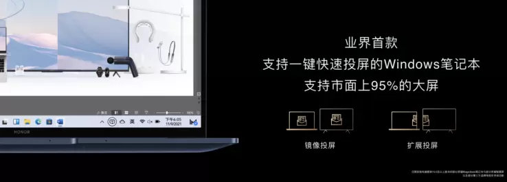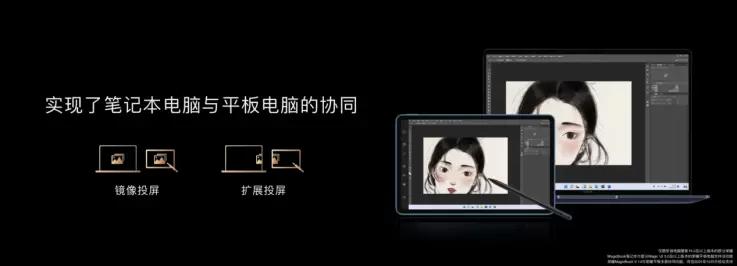 荣耀MagicBook V 14还可直接实现与Pad联动,在镜像模式下,利用Pad的触摸和手写笔能力,辅助PC侧的PS等专业软件获取更好体验,同时视频通话和影音播放从PC到Pad体验接续,让镜像也能顺滑流畅;在扩展模式下,Pad作为PC的扩展屏,同时浏览两个窗口,提升并行处理效率。荣耀MagicBook V 14与荣耀平板多屏协同功能,将在2021年10月升级后支持。