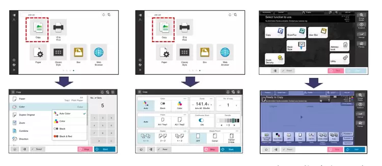 bizhub 750i系列搭载全新的GUI(图形化用户界面),用户可以通过几个简单步骤轻松找到自己所需功能。即使是第一次使用复合机的用户,也可以通过屏幕指示,清晰明了地完成所需的作业,避免耗费额外的时间和培训成本,并且用户还可根据自身使用频率定制使用界面。