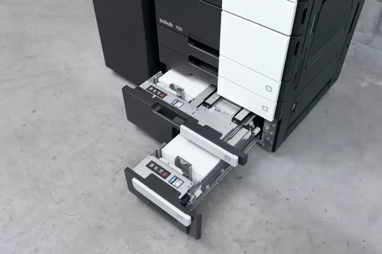 此外,bizhub 750i还具备强大的持续供纸能力,标配了4个纸盒和1个多功能手送托盘,其中包括容量为1500页的复合型纸盒,总供纸容量为3650页。选购大容量纸仓后,设备最大的供纸容量可达6650页。凭借两个大容量纸盒互补供纸,bizhub 750i可实现连续作业、不停机供纸,助力用户降低添加纸张的频次,从而提升工作体验。