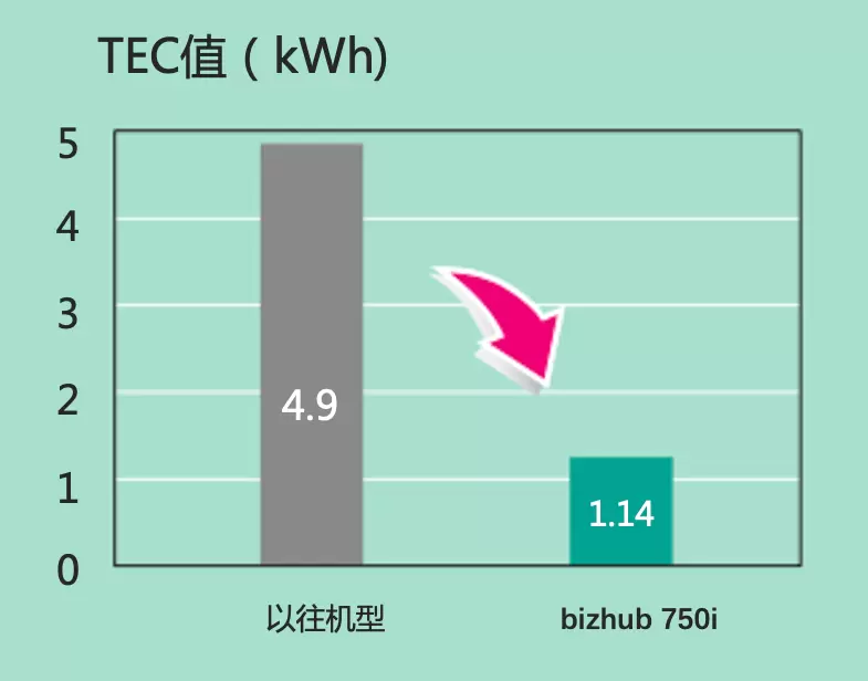 秉持柯尼卡美能达一贯的节能环保理念,bizhub 750i相较于前代机型在节能环保方面也有了大幅提升。bizhub 750i采用了全新开发的碳粉和定影器,可在更低的温度上实现定影。bizhub 750i的TEC值(典型能源消耗数值)为1.14 kWh,可进一步控制二氧化碳排放,降低生产作业时对环境造成的不良影响。