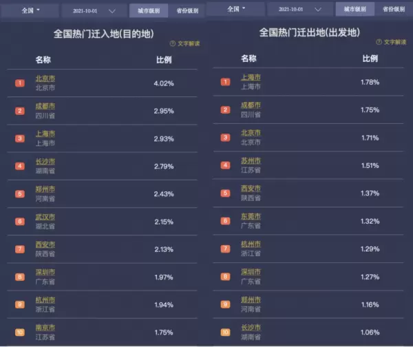 百度地图大数据:国庆首日,北京、成都、上海成为全国热门迁入迁出地前三