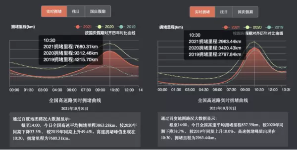 (10月1日2日,截至14:00百度地图出行仪表盘全国高速拥堵趋势对比)