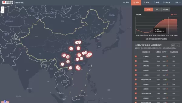 同时,在交通枢纽方面,10月2日03:30开始各大交通枢纽人流指数开始上涨,到11:30到达峰值,随后趋势平缓。截至14:30,广州南站、杭州东站、上海虹桥站人流指数位列前三。