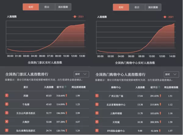 (截至10月2日14:00百度地图出行仪表盘全国热门景区、购物中心人流指数)