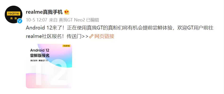 10月5日,realme真我手机官方宣布,Android 12来了。