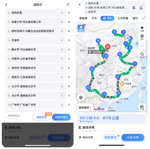 长途出行,如果途经多个地点,便可以通过百度地图全新升级的多途经点路线规划功能,一键智能规划最顺路线。最新版百度地图支持最多输入15个途经点,如有特定顺序需求,也可按需调整,更人性化的服务让你的十一返程事半功倍!