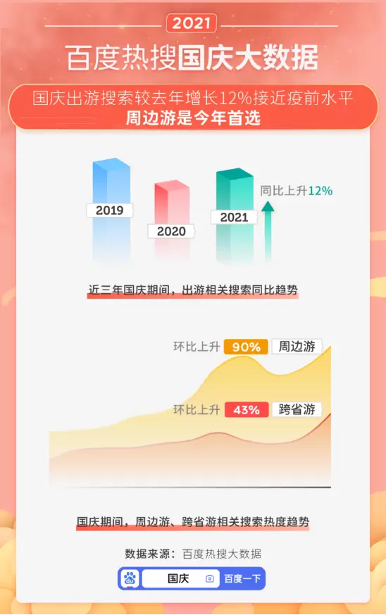 疫情多变,不容轻视,多数网友将出游目的地选在了城市周边。大数据显示,周边游的整体热度及环比增长幅度远高于跨省游,是今年国庆出游的主要模式。