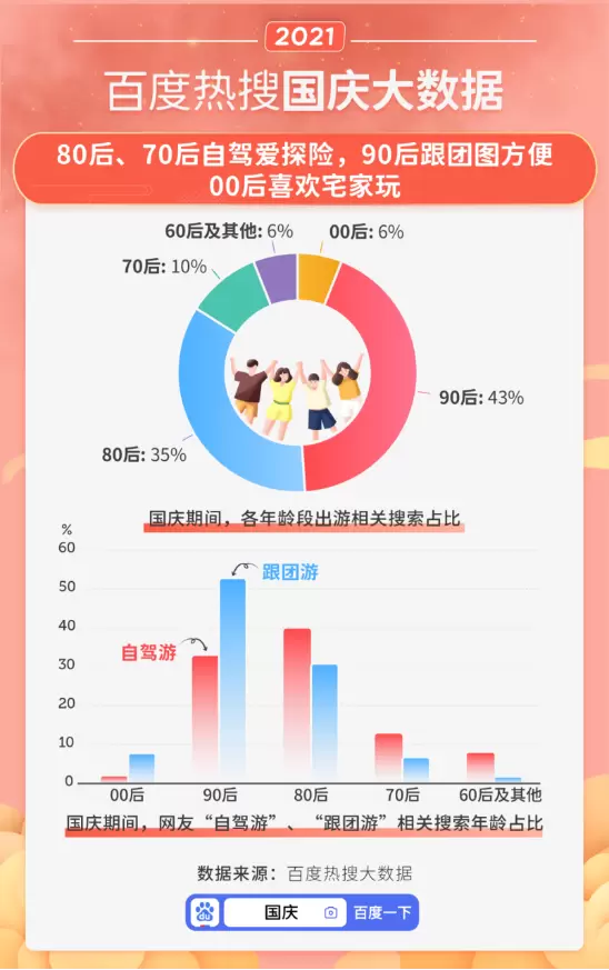 从出游人群来看,90后依然是今年国庆出游的主力。大数据显示,不少90后游客都接受跟团游,以追求更简单直接的出游体验,而80后、70后体现了更强烈的自驾情怀。与之相比,经济多未独立的00后对自主出游的关注更低,他们更倾向在家学习娱乐,或是交由家庭安排。