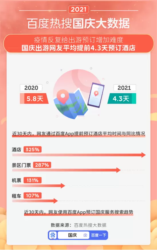 大数据发现,疫情的不确定性,给出游预订带来难题。同比2020年,网友通过百度App提前预订酒店的平均时间从5.8天缩短至4.3天,显示出一部分网友的观望态度。尽管临近出游预订的情况多有出现,但预订这一方式本身已成为网友习惯。百度App的平台统计显示,酒店、景区门票、机票、租车等预订热度均在国庆期间激增。