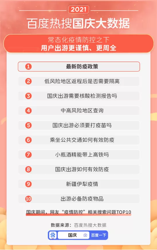 网友国庆出游的热搜问题,也彰显公众对防疫工作的关心。大数据显示,“最新防疫政策”是国庆期间“疫情防控”相关搜索中的最热问题。根据疫情随时调整计划,网友做好了多重准备。