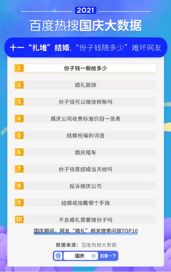 国庆不出远门,另一个原因可能是参加婚礼。今年国庆,婚礼“刷屏”,大数据显示,网友普遍热搜的问题是“份子钱一般给多少”。各地惯例不同,份子钱成为普遍难题。可见国庆的钱包“挑战”,不仅体现在旅游,还可能夹杂在亲朋的美好婚礼中。