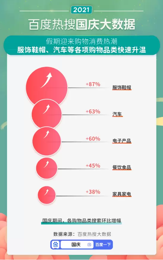 国庆也是添置好物的时机。大数据发现,国庆假期带来网友购物消费热潮。其中,服饰鞋帽、汽车、电子产品等购物品类的搜索热度都在快速升温。