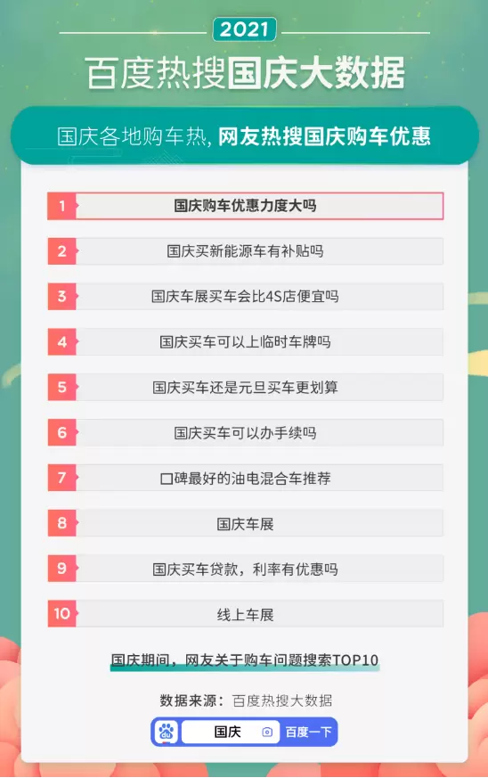 具体到“大件”来看,想趁国庆换辆好车的网友不在少数。大数据指出,国庆期间,“购车”相关搜索热度增长63%。具体热搜问题中,网友最想了解国庆购车的优惠力度,以决定是否要在国庆假期里下定决心买车。与此同时,新能源汽车补贴也是网友国庆购车查询的兴趣因素之一。