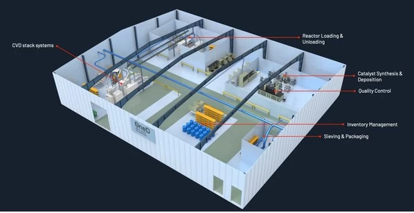 该中试工厂的每栋厂房都将配备用于交付商用石墨粉末的端到端加工设备。通过使用之前不昂贵的设备,该工厂能在每台CVD机器上提供最高达3400辆电动汽车电池的年试产产能。